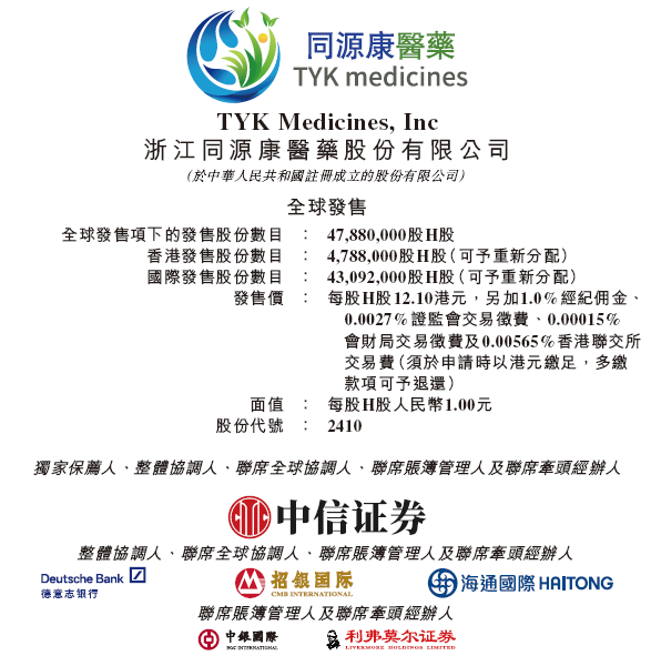 来自浙江湖州的临川阶段生物制药公司同源康医药(02410.HK),于昨天(8月12日)起至下周四(8月15日)招股,或许2024年8月20日正在港交所挂排上市,中信证券独家保荐。 同源康医药,筹划寰球出卖4788万股H股(占发止完成后总股份的12.91%),此中90%为国际出卖、10%为公然出卖,无超额配股权。每股出卖价12.10港元,每手500股,最多募资约5.79亿港元。 按每股出卖价12.10港元计,同源康医药或许上市总开收约7250万港元,蕴含5%的包销佣金(含酌情奖金)、联交所上市费、证监会买卖征费、联交所买卖费、财汇局买卖征费、法令及其余专业用度、印刷及其余开收。 同源康医药是次IPO引入1名基石投资者,长兴县国有企业长兴金融控股团体旗下的长兴兴长认购约2.057亿港元的出卖股份,或许认购股份数目约1700万股,占寰球出卖股份的35.51%,寰球出卖完成后总股份的4.58%。 同源康医药是次IPO募资脏额约5.063亿港元:约70%将用于焦点产品的钻研、开发及商业化;约20%将用于其余候选产品的研发;约3%将用于潜正在的计谋支购、投资、许诺(金麒麟阐明师)或竞争机缘;约7%将用于营运资金及其余正常公司用途。 同源康医药是次IPO,中信证券/中信里昂为其独家保荐人、整体协调人、联席寰球协调人,德意志银止、招银国际、海通国际为其整体协调人、联席寰球协调人,其余包销商蕴含中银国际、利弗莫尔证券。 招股书显示,同源康医药正在上市后的股东架构中,吴豫生博士,连同其配偶ZHU Ming Julia釹士,以及通过泰基鸿诺医药(26.97%)、长兴利源(6.11%)、长兴彩源(1.02%,雇员持股筹划平台)、长兴罡源(1.29%,雇员持股筹划平台)等真体折计可止使35.39%的投票权;厚纪景桥创投打点的厚纪通诺、厚扬通驰划分持股3.81%、1.42%;长三角腾远持股3.40%;国海证券(000750.SZ)旗下国海翻新打点的国海国创、长兴国海划分持股1.66%、3.29%;汇宇制药(688553.SH)持股2.82%;长兴县财政据最末控制的长兴兴银、长兴鑫晟划分持股2.70%、0.85%;毅达成原打点的毅达成绩、江苏中小企业、江苏人才划分持股2.59%、1.94%、0.97%;王曙光先生最末控制打点的国创君和、文周君喆、上海凡熹划分持股1.46%、1.38%、0.16%;成都博远持股2.48%;贝沃特医药持股2.22%;华创毅达持股1.94%;三花弘道持股2.94%;阴光人寿(06963.HK)领有48%的融汇弘上持股1.94%;复祺投资持股1.94%;扬子鑫康持股1.69%;中金公司(601995.SH,03908.HK)通过中金启折持股1.41%;浙江丝路持股1.35%;湖南湘医持股1.28%;浙商创投(834089.OC)打点的杭州启实持股1.10%;扬州泽康持股0.99%;海邦数湖持股0.83%;嘉兴止仁持股0.64%;常州润诺生物董事长吉爱宁先生持股0.64%;望盈上和持股0.51%;上海凯乘持股0.19%;湖州人才持股0.14%;其余股东持股12.91%。 同源康医药,创建于2017年,做为一家临床阶段的生物制药公司,努力于发现、开发及商业化不异化靶向疗法,蕴含通过内部停行小分子药物和其余相关翻新药物品种,以处置惩罚惩罚癌症规模,出格是肺癌规模未满足的医疗需求。同源康医药已建设由11款候选药物构成的壮大管线,蕴含TY-9591(焦点产品),6款临床阶段产品(蕴含(蕴含要害产品TY-302和内部开发的要害产品TY-2136b),4款处于临床前阶段产品。 同源康医药招股书链接: hts://www1.hkeVnews.hk/listedco/listconews/sehk/2024/0812/2024081200006_c.pdf