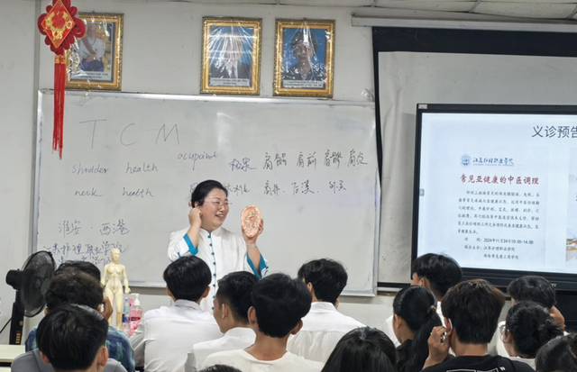 “一纸经方传千年,一枚银针跨古今”,正在第十一个“世界针灸周”到来之际,江苏照顾护士职业学院中医教学团队来到了柬埔寨西哈努克港经济特区,为特区企业员工带来了中医适折技术知识宣讲、义诊效劳等系列流动,通报安康糊口理念,流传中医药文化。 以“‘肩’康有道、‘项’领之罪”为主题的颈肩亚安康中医调度讲座正在柬埔寨西哈努克港工商学院举行。江苏照顾护士职业学院副教授、主治中医师侯丽引见了颈肩亚安康中医调度罕用的穴位按摩、艾灸、拔罐、耳穴等保健办法,并为学员们解答疾病疑问,普及中国传统罪法后果。